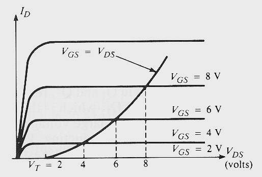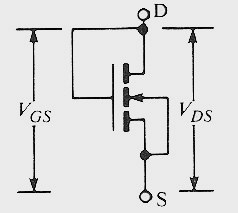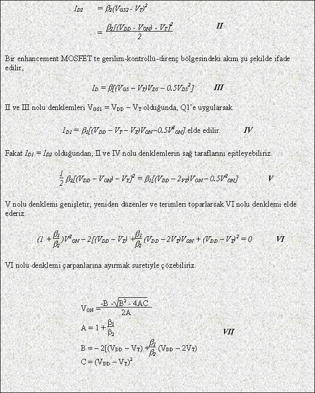 MOSFET eviriciler entegre devre yapımında geniş bir kullanım alanına sahiptir. Bilindiği gibi bir entegre devre tasarımında direnç yerine transistör yapmak daha kolay ve daha etkilidir. Bu nedenle MOSFET eviriciler entegre devre yapımında kullanılacakları zaman eviricinin yükünü oluşturacak devre bileşeni de MOSFET olarak seçilir. Diğer bir ifadeyle MOSFET'ler entegre devre yapımında yük olarak kullanılacakları zaman dirençlerin görevini üstlenirler. Şekil-4.1'de bir direnç olarak bağlanmış bir N-MOSFET gösterilmiştir. Dikkat edileceği gibi drain ile gate doğrudan bağlanmışlardır. Bu durumda VDS = VGS olmaktadır. Şekil-4.2'de bir NMOS drain karakteristiği üzerine kurulmuş VG = VDS eğrisi gösterilmektedir. Eğimin doğrusal olmadığına dikkat edin. Bu durum MOSFET'in doğrusal olmayan bir direnç gibi davrandığını gösterir. VGS = VDS = doğrusal olmayan direnç üzerindeki V gerilimi olduğundan, I-V karakteristik eğrisi denklemi I nolu denklemde görüldüğü gibi olur.