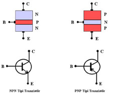 NPN ve PNP türü olan tranzistörün 3 bağlantı ayağı vardır. Bunlar Kollektör(C), Emetör(E) ve Baz(B) olarak adlandırılır. Resim-3'de NPN ve PNP tranzistörler gösterilmiştir.