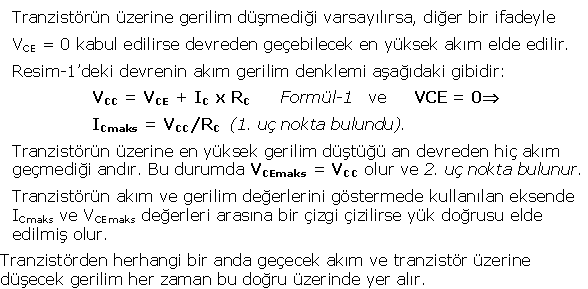 Resim-1'de NPN ve PNP tranzistörlü iki ayrı emetörü ortak yükselteç devresi gösterilmiştir. Bu iki devrenin matematiksel olarak incelenmesi işaret yönleri dışında farklı değildir. Ancak uygulamada daha kararlı çalışma durumu göstermesi nedeniyle NPN tipi yükselteç devreleri tercih edilir. Bu devrenin DC yönden incelenmesi için yük doğrusu dediğimiz ve RC, RB dirençlerinin ve VCC geriliminin aldıkları değerlere göre çalışma noktasının tespit edilmesinde yararlandığımız bir doğru kullanacağız. Resim-2'de emetörü ortak kuvvetlendiricinin yük doğrusu gösterilmiştir.
