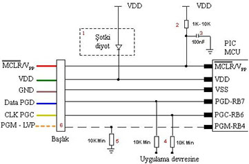 VPP (ya da MCLR) : Programlama Voltajı (genellikle 13V) HVP programlamada, RS232 COM port, paralel port ya da USB port üzerinden bilgisayar ile mikrodenetleyici arasında bağlantı sağlayan donanımlar kullanılır (Bkz. Şekil 2.15 ve 2.16). Bilgisayar üzerinden hex dosyası seri iletişim programlaması yoluyla (ICSP) mikrodenetleyiciye yüklenir. ICSP ile PIC mikrodenetleyicinin programlanması için gerekli bağlantı yolları ve PIC12F serisi mikrodenetleyici için örnek uygulaması Şekil 2.18’de gösterilmiştir.