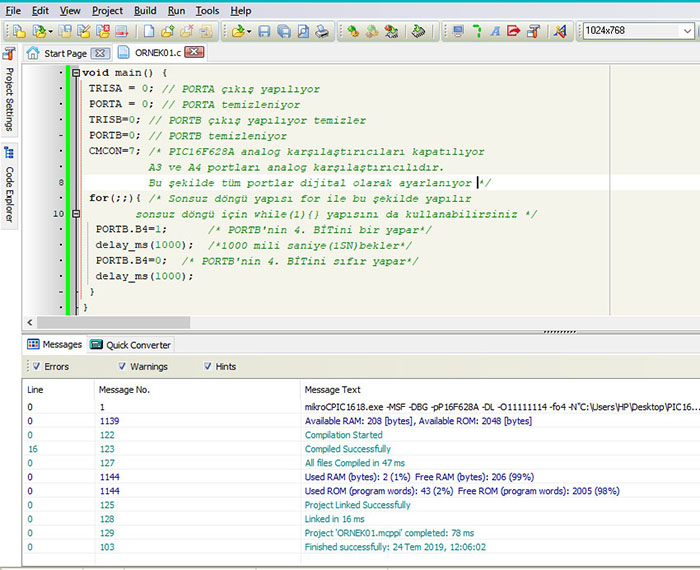 Eğer derleme başarılı olursa, şekilde görüldüğü gibi derlemenin başarılı olduğuna ve program kodunun denetleyici hafızasında ne kadar yer kapladığına dair mesaj satırları belirir (Bkz. Şekil 2.5). Eğer Şekil 6’dakine benzer bir kod yazım hatası yaptıysanız şeklin altında gözüken hata mesajını alırsınız. Örnek hata mesajının sebebi 13’ünci satırdaki kodun sonuna yazılması gereken satır sonu “;” karakterinin yazılmamış olmasıdır. Böyle bir hatanın elde edilmesi durumunda hatanın giderilmesi ve derleme işleminin yeniden yapılması gerekir.
