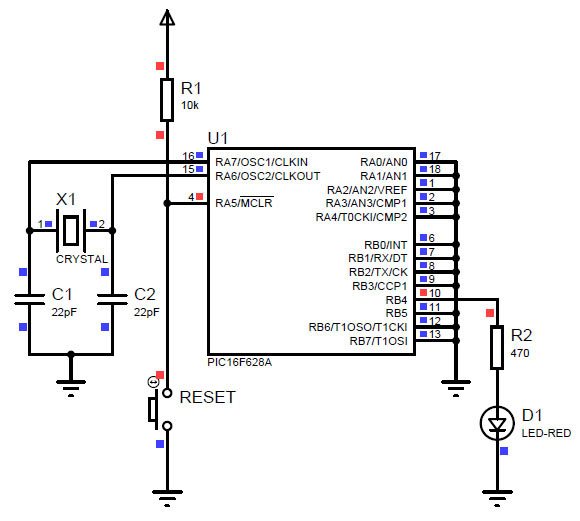 NOT-3: Ayrıca yapılan ilk uygulamada görüldüğü üzere boşta kalan diğer port pinleri topraklanmıştır. Her uygulama için bunun yapılmasına gerek yoktur. Ancak gerçek endüstriyel uygulamalarda kullanılmayan portların da temizlenmesi ve mümkünse topraklanması devrenin çalışmasını etkileyecek istenmeyen parazitlerin toprak hattına iletilmesini sağlar. PIC16F628A’nın fiziksel özellikleri ve proje editörünün kullanımı ile ilgili ayrıntılı bilgi için EK-D'ye bakınız.