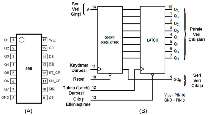 ![]() Şekil-6.3 74HC595 8 bitlik kaydırmalı kaydedici entegresi