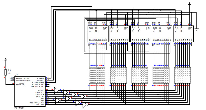 Şekilde görüldüğü üzere 8x8 nokta matris üzerinde 5x8 boyutunda üreteceğimiz karakteri öncelikle sağa hizalı olarak hazırlıyoruz. Her bir satırı 1 baytlık veri olarak düşünecek olursak 00h – FFh arasında değişen bir onaltılı kod elde edileceği görülür. D3-D0 arasını baytımızın LSB kısmı, D7-D4 arasını ise MSB kısmı olarak düşünürsek örnek karakter için şekilde elde edilmiş kodu bulursunuz. Şekil 6.8’de benzer mantıkla tasarımı yapılmış 5 adet 8x8’lik nokta matris kayan yazı sürücü devresi gösterilmiştir. Yapılan uygulamada nokta matrislerin sütun hatları (katot bacakları) mikrodenetleyicinin portu üzerinden sürüldüğü için bu portların çıkışına yeterli sayıda 7404 entegresi bağlanmalıdır. 7404 entegresi içinde bağımsız olarak 6 adet NOT kapısı bulunduran bir lojik tersleme entegre devresidir. Dolayısıyla bu entegreden iki adet kullanılması gerekir. PROTEUS-ISIS® programında çizim kolaylığı olması açısından 74HC595 ile nokta matris göstergeler arasına direnç çizilmemiştir. Gerçek uygulamada her bir bacak için olmak üzere toplamda 5x8 = 40 adet 330 Ω direnç bağlanmalıdır.