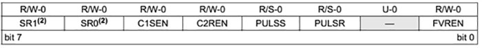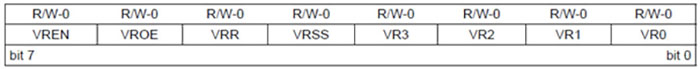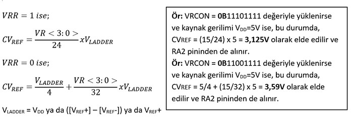 Aşağıda açıklandığı üzere VRCON kaydedicisi voltaj referans modülünü ayarlamak için kullanılır. VRCON: VOLTAJ REFERANSI KONTROL KAYDEDİCİSİ (ADRES: 97h – PIC16F887, CVRCON: FB5h – PIC18F2550)