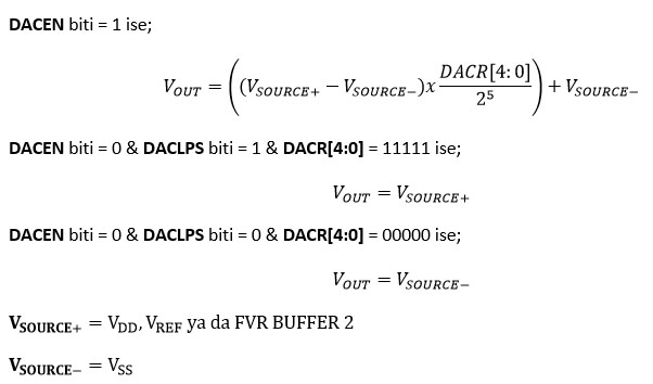 DAC, DACCON0 kaydedicisinin DACEN biti ayarlanarak etkinleştirilebilir. DAC çıkış geriliminin nasıl elde edildiği Tablo 7.12’de gösterilmiştir. Tablodan görüleceği üzere analog çıkış gerilimi (VOUT) hiçbir zaman tam olarak kaynak gerilimine (VSOURCE+) eşit olmamaktadır. DAC modülünü etkinleştiren DACEN pini kurulduğunda ve kaynak gerilimi VDD olarak ayarlandığında, en yüksek çıkış gerilimi DACR pinlerinin ‘11111’ olarak ayarlanması durumunda elde edilir. Bu durumda VDD gerilimi 5V olarak düşünülürse; VOUT = 5x(31/32)=4,84V olarak elde edilir. Tablo 7.12 DAC çıkış voltajının hesaplanması