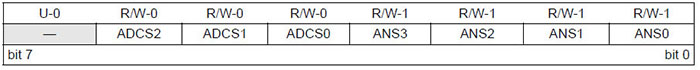 bit 7 Kullanılmıyor: '0' olarak okunur. PIC16F887 mikrodenetleyicisinde de ANSEL kaydedicisi vardır ve yalnızca ilgili analog kanalı analog ya da dijital olarak ayarlamak için kullanılır. Her bite bir kanal karşılık gelir. Bu mikrodenetleyicide toplamda 13 analog kanal olduğundan ek olarak ANSELH kaydedicisi de bulunur. Aşağıda bu kaydedicilerin bit dağılımları gösterilmiştir. Kanalların ayarlanması ve davranışı PIC12F675 mikrodenetleyicisinin ANS3:ANS0 bitleri gibidir.