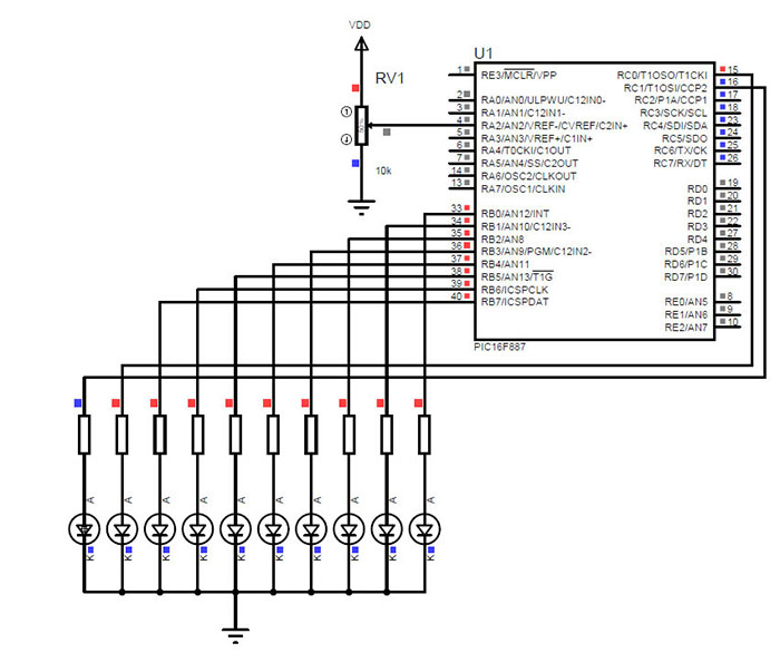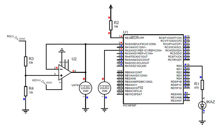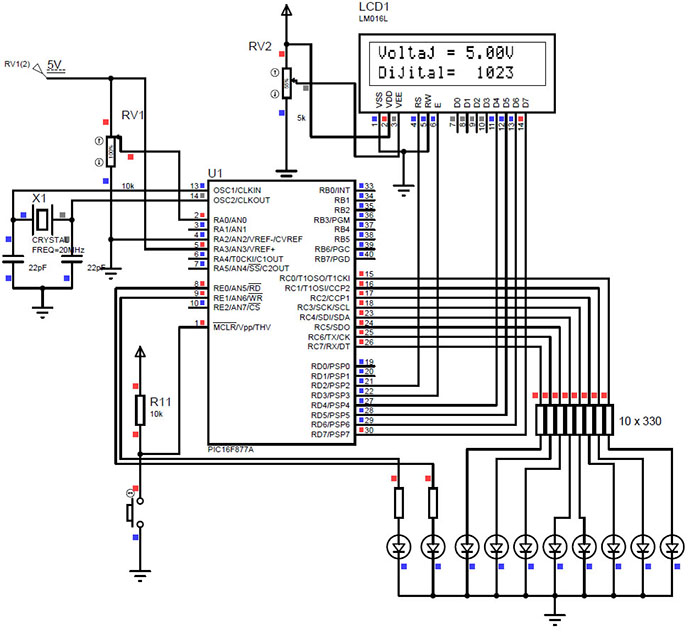 ![]() Şekil 7.10 PIC16F877A ile harici voltaj referanslı ADC dönüşümü