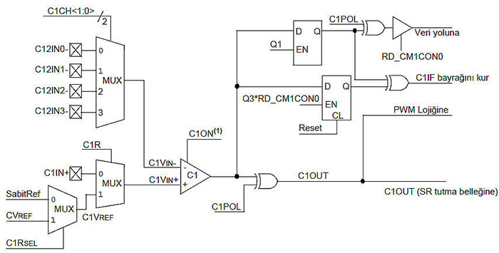 bit 7 C1ON: C1 karşılaştırıcısı etkinleştirme biti C1 karşılaştırıcısının basitleştirilmiş blok diyagramı Şekil 7.12’de gösterilmiştir. C1ON biti lojik-0 yapıldığında XOR kapısına lojik-0 çıkışı gönderilir. Q1 ve Q3 saat çevrimleri dört fazlı sistem saati çevriminin adımlarını ifade etmektedir. Q1 sinyali uyku modunda lojik-1 seviyesinde tutulmak suretiyle sistemin uyku modunda da çalışmaya hazır halde tutulması sağlanır.