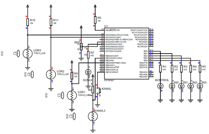 Şekil 7.14’te C1 karşılaştırıcısını ve eviren giriş olarak 4 analog kanalı kullanan bir uygulama devresi gösterilmiştir. Devrede RB7 pinine bağlı buton yardımıyla sırasıyla 4 analog kanaldan biri seçilmektedir. Karşılaştırıcının eviren girişi olarak kullanılan her bir analog kanal girişine ışığa duyarlı eleman olan LDR bağlanmıştır. Seçilen analog kanaldaki bilgi, evirmeyen giriş kanalı RA3/C1IN+ pinine bağlı potansiyometre ile ayarlanmış olan voltaj seviyesiyle karşılaştırılmaktadır. Karşılaştırma sonucu RA4/C1OUT pinine bağlı LED yardımıyla dijital olarak alınmaktadır. O an için hangi kanalın aktif olduğunu görebilmek için sırasıyla ilgili kanalı simgeleyen ve D portuna bağlanmış olan LED’ler aktif olmaktadır. RB7 pinine bağlı buton mikrodenetleyicinin port durum değişim kesmesini kullanarak çalışmaktadır. PIC16F887, B portunun her bir pini bağımsız olarak ayarlanabilme özelliğine sahiptir. Dahili zayıf çekme direncinin (weak pull-up) aktif kılınması için OPTION_REG kaydedicisinin (RBPU) ̅ bitine ek olarak WPUB (Weak Pull-Up port B) kaydedicisinin de ayarlanması gerekir. Benzer şekilde, port durum değişim kesmesi için INTCON kaydedicisinin RBIE bitine ek olarak IOCB (Interrupt On-Change port B) kaydedicisinin de ayarlanması gerekir.