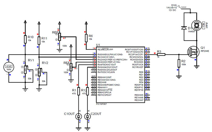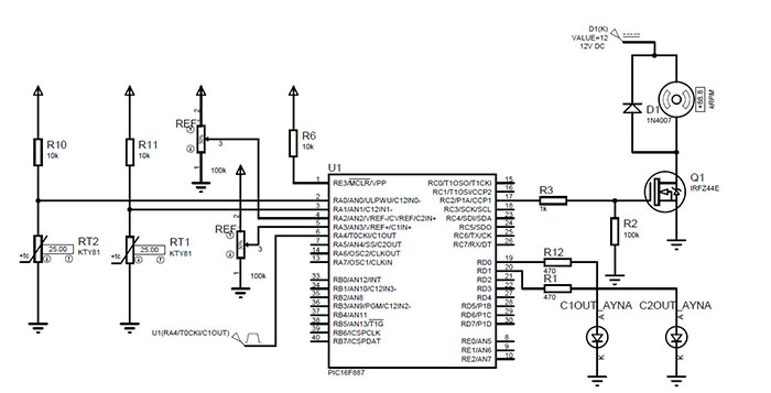 Uygulamada görüleceği üzere, karşılaştırıcıların eviren analog girişleri için pozitif sıcaklık katsayılı termistörler (PTC) kullanılmıştır. Program kodunda karşılaştırıcıların çıkış polariteleri terslenmektedir. Böylece, sıcaklık arttığında PTC dirençleri yükselmekte ve negatif giriş (eviren), pozitif girişten (evirmeyen) yüksek voltaj seviyesine ulaşınca polarite terslemesinden dolayı karşılaştırıcı çıkışları lojik-1 seviyesine ulaşmaktadır. Elde edilen karşılaştırıcı çıkış değerlerinin ayna değeri RD0 ve RD1 pinlerine yönlendirilmektedir. Her iki karşılaştırıcı çıkışı da lojik-1 olduğunda RC2/CCP1 pinine bağlı mosfet kontrollü 12V DC motor çalıştırılmaktadır. Tablo 7.7 C1 ve C2 karşılaştırıcılarının ayna çıkışlarının kullanılması örneği mikroC kodu