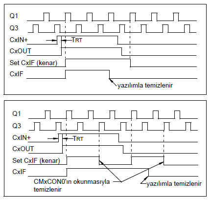 NOT1: CMxCON0 kaydedicisine yazma komutu (kaydedicinin tamamına ya da herhangi bir bitine) gerçekleştiğinde de eşleşmeme durumu ortadan kalkar. Çünkü her yazma komutu aynı zamanda yazma çevriminin başında okuma işlemi de içerir. Karşılaştırıcı kesmesi eşleşmeme seviyesiyle değil eşleşmeme kenar tetiklemesiyle gerçekleşir. Bu, CMxCON0 kaydedicisiyle okuma/yazma işlemi yapmadan kesme bayrağının resetlenebileceği anlamına gelir. Eşleşmeme durumunu izleyen kaydediciler temizlendiğinde, karşılaştırıcının önceki durumuna dönmesine bağlı olarak bir kesme üretilecektir. Aksi takdirde, kesme üretilmeyecektir. Bu durumlar Şekil 7.16’da gösterilmiştir.