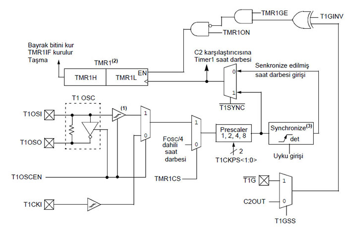 ![]() Şekil 7.18 PIC16F887’nin Timer1 blok yapısı