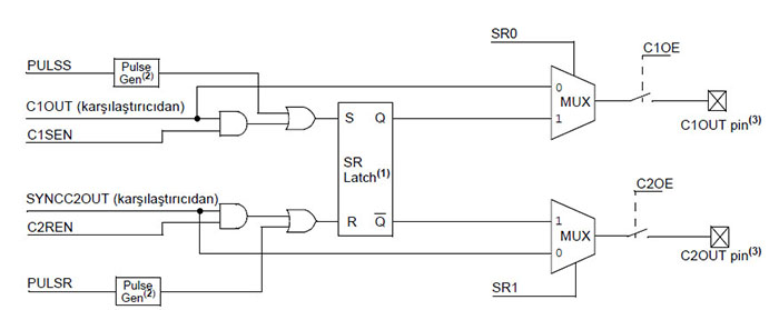 Karşılaştırıcı SR (Set-Reset) Tutma ÖzelliğiSR (Set-Reset) tutma özelliği karşılaştırıcı çıkışlarına ek bir kontrol özelliği kazandırır. Modül tek bir SR tutma devresi ve çıkışta çoktan seçicilerden (multiplexer-MUX) oluşur. SR tutma devresi set edilebilir, resetlenebilir ya da geçişli (toggle) ayarlanabilir. SR tutma devresi ayrıca, SRCON kontrol kaydedicisinin ilgili bitleri yardımıyla karşılaştırıcı çıkışından bağımsız olarak set ya da reset edilebilir. SR tutma devresinin çıkış MUX’ları, karşılaştırıcı çıkışını ya da tutma devresi çıkışını I/O portuna yönlendirmeyi sağlar.