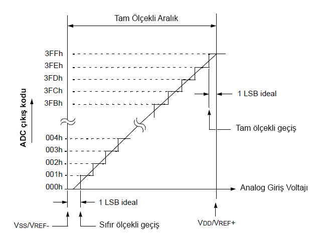 ![]() Şekil 7.2 Voltaj referansı aralığına göre analog sinyalin 10-bitlik ölçeği