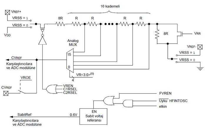 bit 7: SR1: SR tutma devresi konfigürasyon bitidir. SR tutma devresi çıkışının I/O pinine aktarılabilmesi için öncesinde ilgili CxOE bitinin kurulması ve TRIS komutuyla da çıkış ayarının yapılması gerekir. Tutma devresi, bir saat kaynağına bağlı olmayan (bu yönüyle flip-flop devrelerinden ayrılır) Set-Reset özellikli bir devredir. Set-Reset girişlerinin her biri aktif yüksek (lojik-1) seviyelidir. SR tutma devresinin her iki girişi de bir karşılaştırıcı çıkışına ve yazılım kontrollü darbe üretecine bağlıdır. Tutma devresi C1OUT ile ya da SRCON kaydedicisinin PULSS bitiyle set edilebilir. Benzer şekilde, C2OUT ile ya da SRCON kaydedicisinin PULSR bitiyle resetlenebilir. Tutma devresi baskın olarak reset özelliklidir. Çünkü her iki girişi de aktif yüksek seviyede olduğunda tutma devresi reset durumuna geçer. NOT: Tutma devresinin S ve R olarak iki girişi olduğu gibi Q ve Q olarak iki çıkışı vardır. Tutma devresinin S girişi lojik-1 ve R girişi lojik-0 olduğunda Q çıkışı lojik-1 olur. R girişi lojik-1 yapıldığında ise Q çıkışı lojik-0 olur. Q çıkışı Q çıkışının tersi olarak işlem görür. Diğer bir ifadeyle Q’nun lojik değeri neyse, Q tersi lojik değere sahiptir. Karşılaştırıcı Voltaj ReferansıKarşılaştırıcı voltaj referansı modülü karşılaştırıcılar için programlanabilir voltaj referansı üretmeyi sağlayan bir modüldür. Karşılaştırıcılarla yapılan uygulamalarda son derece kullanışlı bir modüldür. Daha önceki uygulamalarda (Şekil 7.14, 7.15 ve 7.17) voltaj referansı olarak, C1IN+ ve C2IN+ girişlerine bağlanan potansiyometrelerle ayarlanan VSS-VDD kaynak gerilimi kullanılmıştı. Bu modül yardımıyla, mikrodenetleyiciyi besleyen VDD gerilim kaynağının ya da harici bir kaynağın programlanarak ayarlanan bir değeri referans olarak kullanılır. Voltaj referans modülü aşağıdaki özelliklere sahiptir: