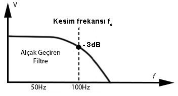 OPAMP devresinin çıkışına basit bir RC devresi ile alçak geçiren filtre devresi bağlanarak testere dişi sinyalin sinüs dalgasına dönüşümü sağlanmıştır. Yüksek frekanslı sinyaller kondansatör üzerinden şaselenmektedir. Kondansatör ve direnç değerleri geçmesi istenen üst frekans değerine göre hesaplanır. Kondansatör değerinin çok küçük seçilmesi durumunda sinyal değişime uğramadan olduğu gibi alınır. Bu nedenle uygun değer seçiminde Denklem 7.1’den yararlanılır ve kesim frekansı hesabı yapılır. Kesim frekansı, güç kaybının yarı yarıya gerçekleştiği ya da sinyal genliğinin √2/2 katı kadar zayıfladığı frekanstır (cut-off frequency - fc). fc=1/2πRCDenklem 7.1