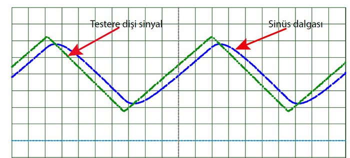 ![]() Kesim frekansını yaklaşık olarak 100 Hz dolaylarında belirlersek R = 1,5 kΩ ve C = 1 uF değerlerinin ideal sonucu vereceği görülecektir. Böylece 50 Hz’lik testere dişi sinyalimiz güç kaybına uğramadan sinüs dalga formu elde edilecek şekilde filtrelenmiş olur. Şekil 7.26’da testere dişi sinyalin ve sinüs dalgasının gösterildiği osiloskop ekranı yer almaktadır.