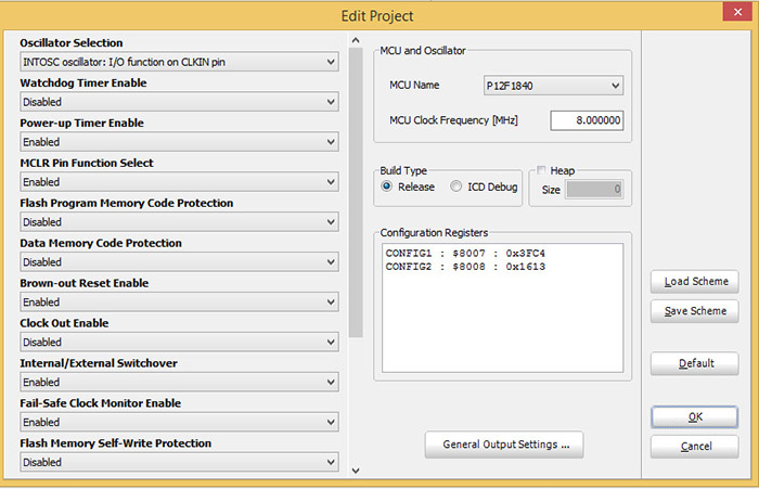 Tablo 7.13’te gösterilen uygulamanın gerçek fiziki devrede de çalışması için konfigürasyon sözcüklerinin ayarlanmasını sağlayan proje düzenleyicisi (Project Edit) penceresinin Şekil 7.27’de gösterildiği gibi ayarlanması yerinde olacaktır. Uygulama devresi 8 MHz dâhili osilatör ile gerçekleştirilmiştir. Uygun frekansın elde edilmesi Timer0 kesmesi kullanılarak gerçekleştirilmiştir. Söz konusu uygulamada yakşalık 20 msn’lik (50Hz) bir periyot elde edilmiştir. ‘while()’ döngüsü içindeki ‘sure’ değişkeni değerini ayarlamak suretiyle belli bir aralıkta farklı frekans değerleri elde edebilirsiniz