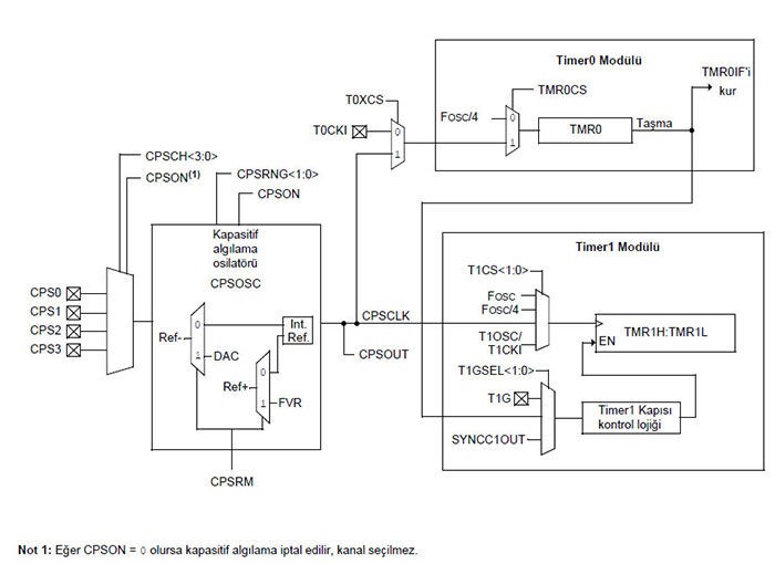 Kapasitif Algılama Modülü (Capasitive Sensing Module – mTouch™)Kapasitif algılama modülü PIC12F1840 ile dâhili olarak sunulmuş ve harici bir elektronik donanıma gerek duymadan yakın mesafeden algılama gerçekleştiren bir çevresel aygıt donanımıdır. Bu tür donanımlar membran panel gibi dokunmatik olarak çalışan tuşların ve butonların yerine kullanılabilir. Yeni nesil ev elektroniği aletlerinde, LCD ekranların kontrolünde, otomobillerde vb. alanlarda günlük yaşamda karşımıza çıkan bir teknolojidir. PIC12F1840 mikrodenetleyicisinin 4 adet kapasitif algılama özellikli pini vardır. PCB olarak hazırlayacağınız bir pedi bu girişlerden birine bağladığınızda ve gerekli kaydedici ayarlamalarını yaptığınızda basitçe çalışacak bir yakın mesafe algılayıcısı tasarlamış olursunuz. Pede parmağınızı yaklaştırdığınızda, ayarladığınız mesafeden algılama gerçekleşecektir. Temel çalışma ilkesi, bu girişlerin kapasitif yükleme etkisine karşı gösterdikleri hassasiyetle ilgilidir. Yaklaşım gerçekleştiğinde kapasitif yükleme etkisiyle birlikte frekans kayması meydana gelir. Timer modülleri kullanılarak frekansta gerçekleşen bu kayma tespit edilir. Şekil 7.28’de Timer0 ve Timer1 modüllerinin kapasitif algılama osilatörüyle birlikte kullanımı gösterilmiştir. Yapılacak uygulamada Timer0 frekans üreteci için zaman kaynağı, Timer1 ise R/C osilatörünü sayıcı olarak olarak kullanılır.