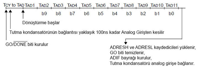 bit 6 Kullanılmıyor: '0' olarak okunur. ADRESH:ADRESL kaydedicileri A/D dönüşümünün 10 bitlik sonucunun kaydedildiği bir SFR kaydedicisidir. A/D dönüştürme işi bittiğinde sonuç bu kaydedicilere yüklenir. ADCON0 kaydedicisinin ADFM bitinin durumuna göre 10 bitlik sonucun ADRESH:ADRESL kaydedicilerindeki dizilimi değişir. A/D dönüştürme işi bittiğinde GO/ (DONE) biti biti temizlenir ve AD kesme bayrağı ADIF biti lojik-1 olur (set edilir). A/D dönüştürme işleminin sağlıklı şekilde yapılabilmesi için sırasıyla aşağıdaki adımlar izlenmelidir: