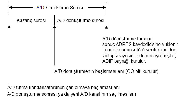 A/D Kazanç İçin GerekenlerA/D dönüştürücülerin çalışma mantığında ilgili kanal girişindeki analog sinyale kondasatör ile şarj olunması ilkesi vardır. Kondansatörün şarj süresi A/D dönüştürücünün kararlı çalışmasını etkileyen önemli bir unsurdur. Şekil 7.5’te A/D dönüştürme işleminin işlem sırası gösterilmiştir.